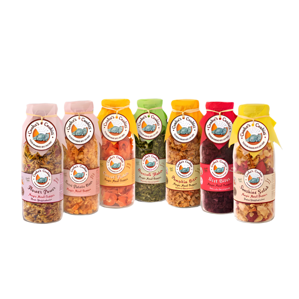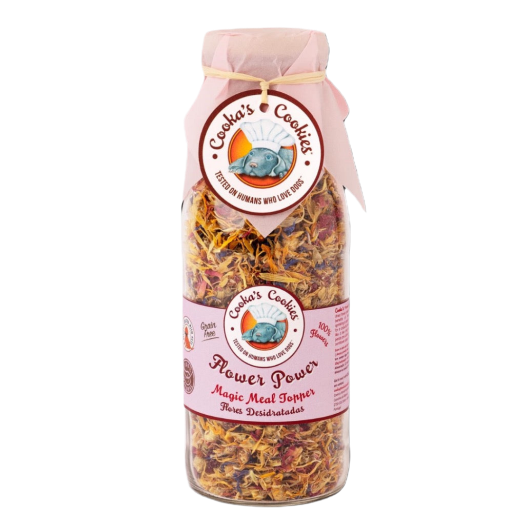 Cooka’s Cookies Flower Power er en delikat og funksjonell meal topper laget av 100 % naturlige blomsterblader: rose, ringblomst (calendula) og kornblomst. Disse lufttørkede urtene av human grade-kvalitet tilfører ikke bare maten et fargerikt og vakkert løft – men også et mildt tilskudd av plantekraft som støtter hud, pels, tarmhelse og kroppens naturlige renseprosesser.