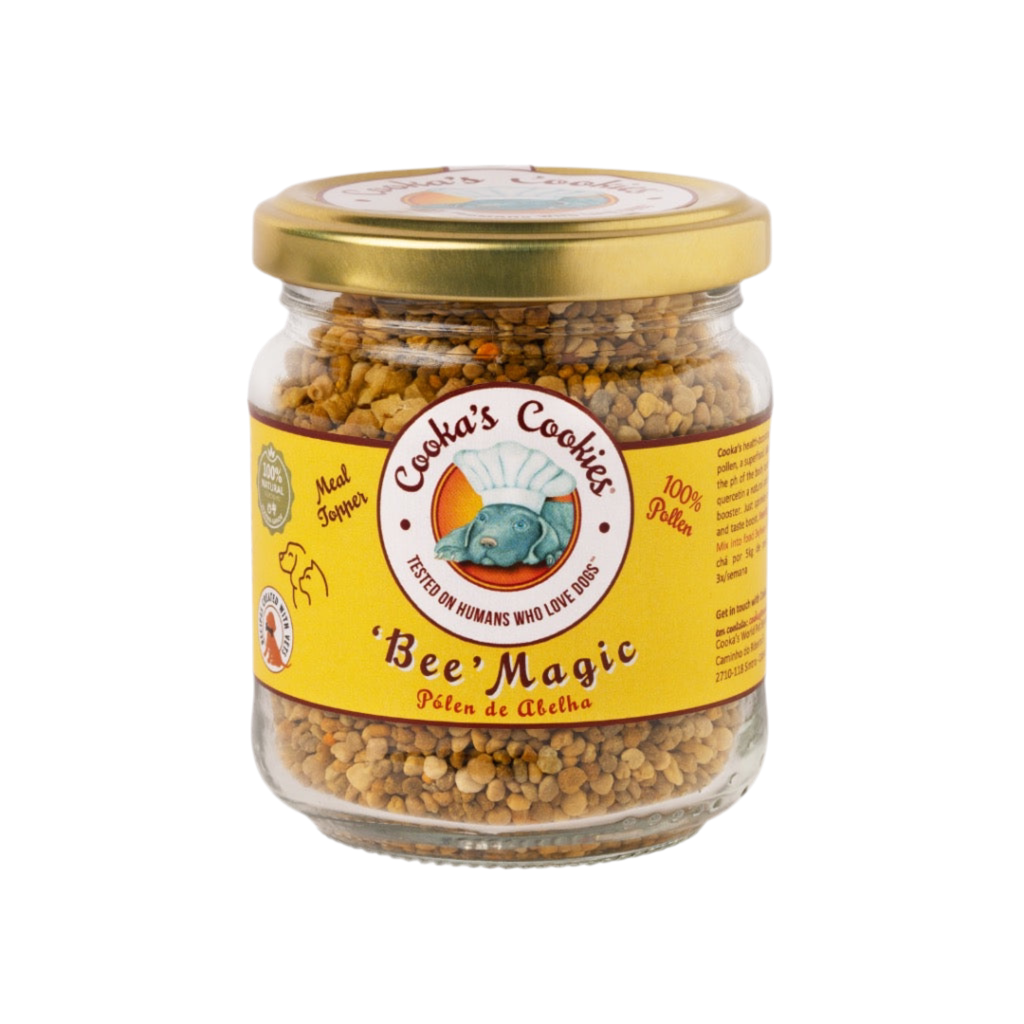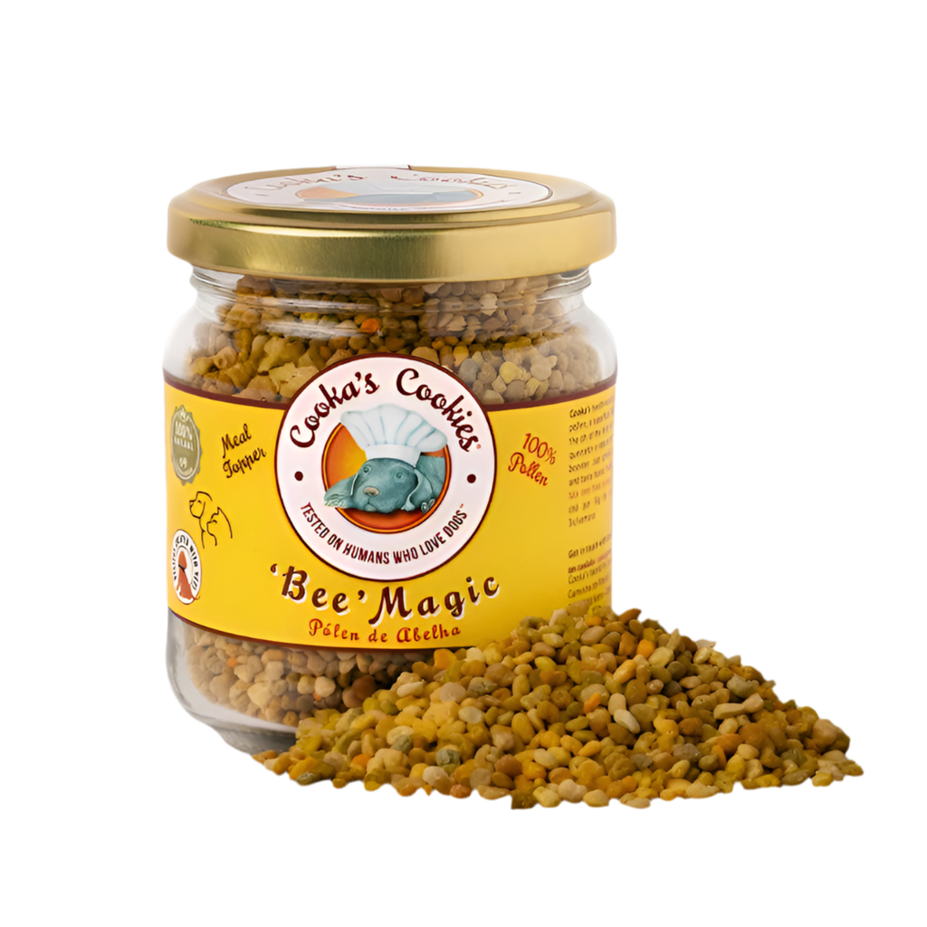 Cooka’s Cookies Bee Magic Meal Topper er laget av 100 % bipollen, og ingenting annet. Dette er naturens eget multivitamin – rik på aminosyrer, enzymer, B-vitaminer, antioksidanter og mineraler – i en form kroppen lett tar opp. Toppingen er laget av human grade bipollen, og gir et daglig løft for energi, pels, hud, vitalitet og ikke minst et sterkt immunforsvar.