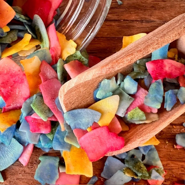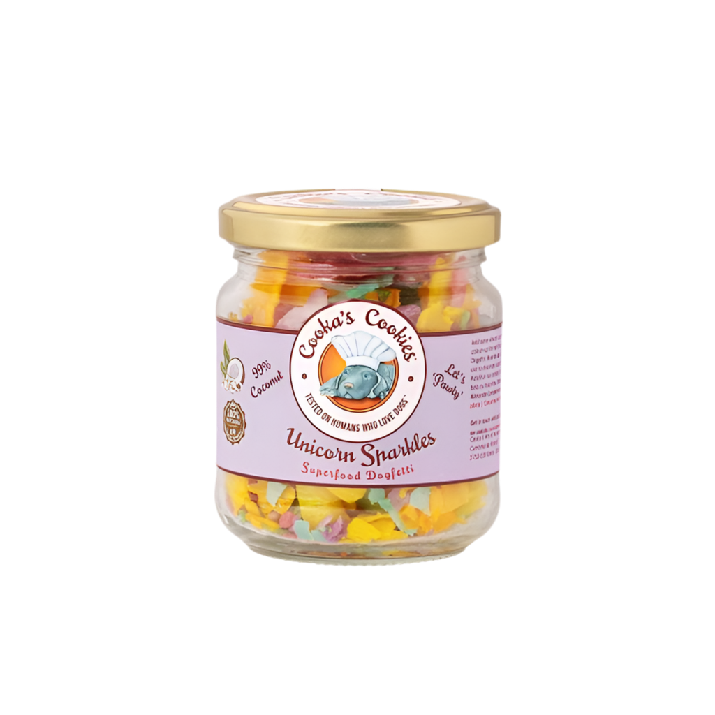 Cooka’s Cookies Unicorn Sparkles er en naturlig meal topper laget med supermat av human grade-kvalitet, som kombinerer kokosflak, rosmarinekstrakt og et fargerikt spekter av funksjonelle planteingredienser som grønn og blå spirulina, gurkemeie og rødbete. Dette er ikke bare en vakker topping – det er en næringsrik, smakfull og funksjonell boost for både hunder og katter.