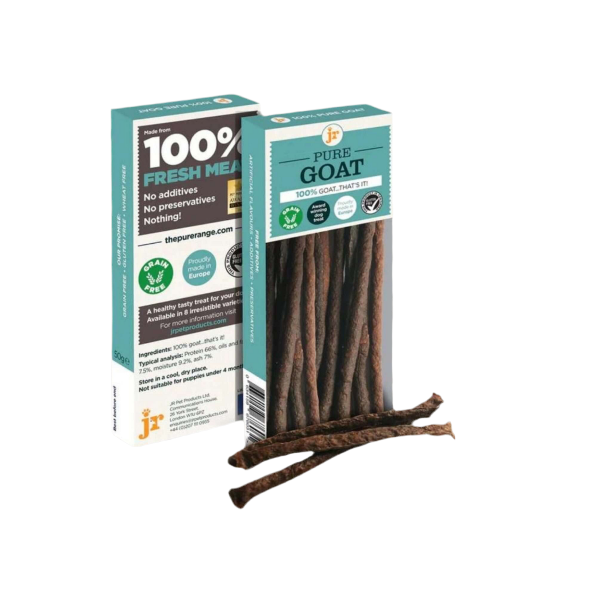 JR Pet Products Pure Goat Sticks består av 100 % rent geitekjøtt, skånsomt lufttørket for å bevare både næringsstoffer og smak – helt uten korn, gluten, soya eller kunstige tilsetningsstoffer. Disse pinnene har en fast og seig konsistens som gir en kortvarig tyggeopplevelse for store hunder, og litt mer motstand for små hunder – uten å være harde som bein.
