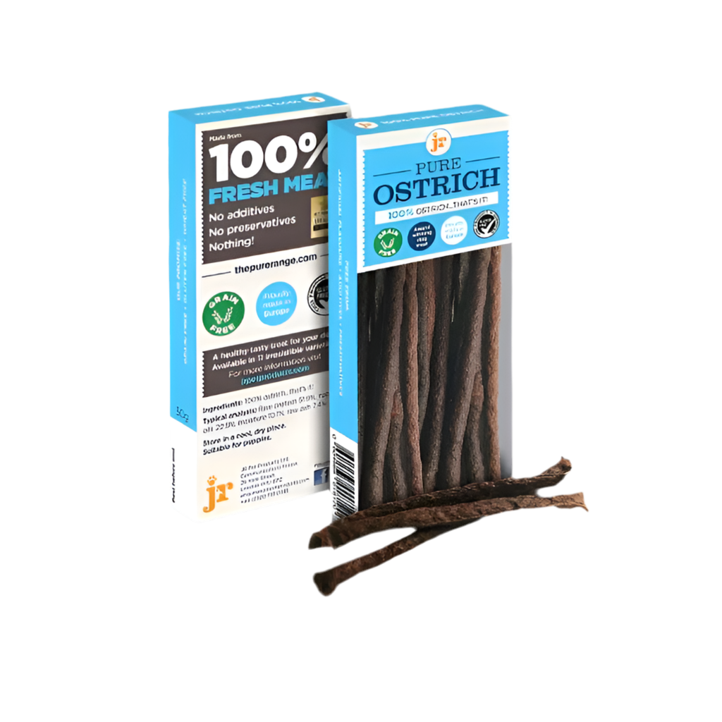 JR Pet Products Pure Ostrich Sticks består av 100 % rent strutsekjøtt, lufttørket på skånsomt vis for å bevare både smak og næringsstoffer. Disse tyggepinnene har en seig, men myk konsistens som gir et kortvarig tygg for store hunder og en passe tyggeutfordring for små og mellomstore raser. Med kun én kjøttkilde og ingen kunstige tilsetninger, er dette et utmerket valg for hunder med allergier, intoleranser eller følsom fordøyelse.