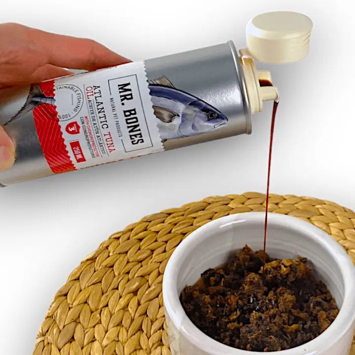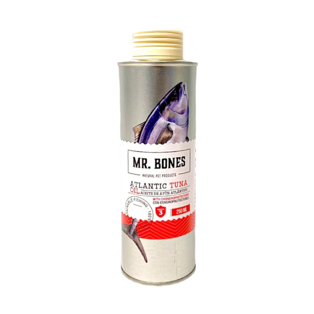 Mr. Bones Tunfisk Olje er en 100 % naturlig fiskeolje utvunnet fra fersk tunfisk, rik på marine omega-3-fettsyrer som EPA og DHA. Dette er et funksjonelt tilskudd til både hund og katt, utviklet for å støtte alt fra hud og pels til ledd, hjerte og kognitiv funksjon. Med høy smakelighet og dokumentert nytte er dette et enkelt, effektivt og naturlig tillegg til ethvert måltid.