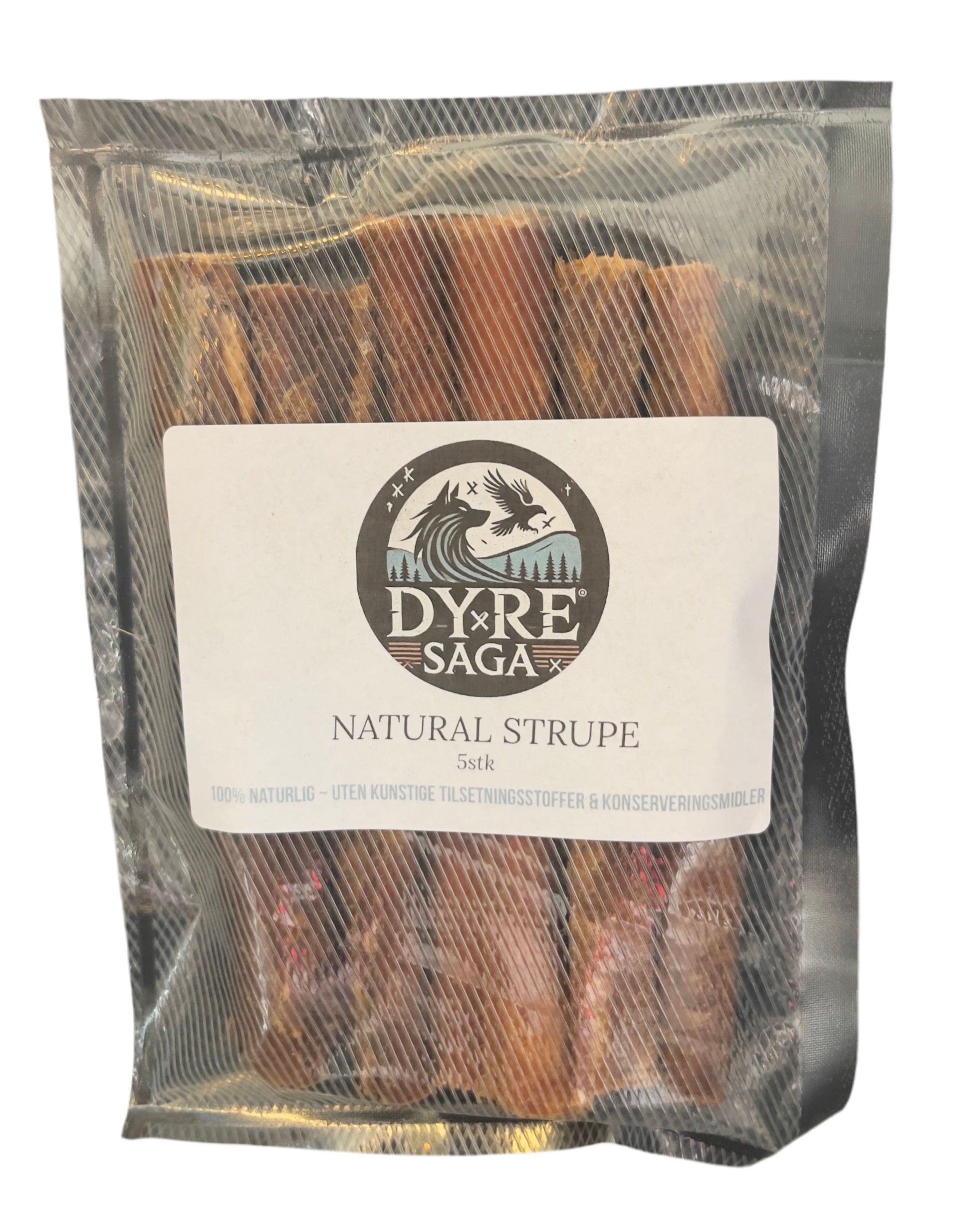 Tørket strupe gir knasende tyggetid, uten å være for hard. Den egner seg godt for både unge og eldre hunder, og kan også brekkes i mindre biter for trening.